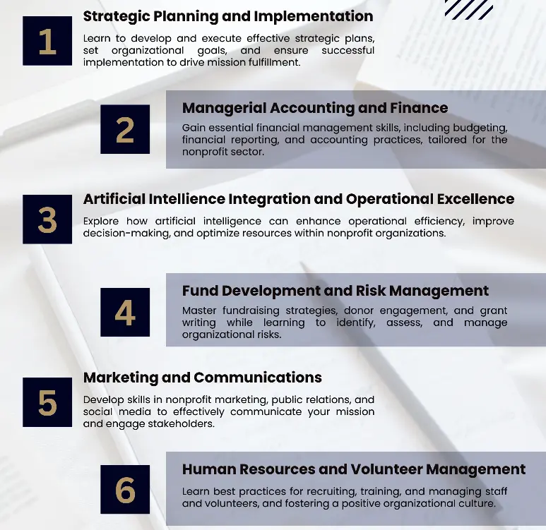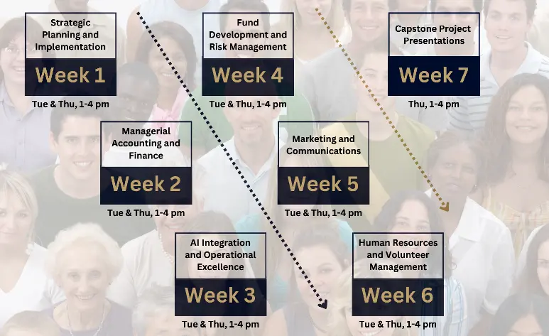 Participants will engage in a dynamic and interactive learning experience, covering key areas such as strategic planning, financial management, AI integration, fundraising, marketing, and human resources.
