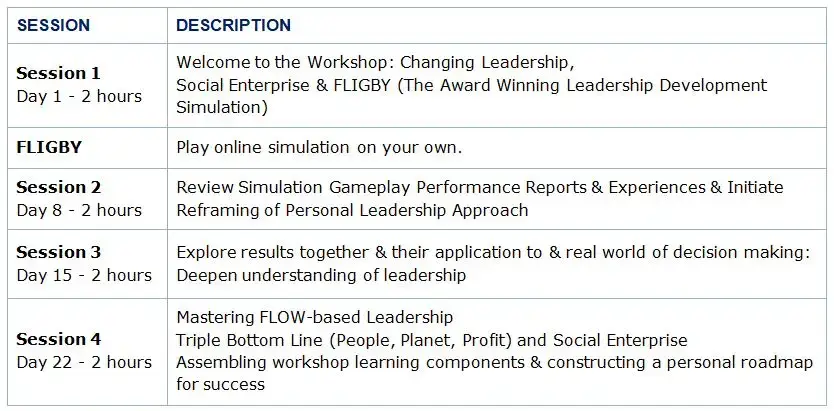 - Discover the power of the blended learning experience, using FLIGBY, an independent online simulation and diagnostics, with a powerful targeted workshop, which together equip participants to chart their own change plan for personal and professional growth/development in a social enterprise environment.